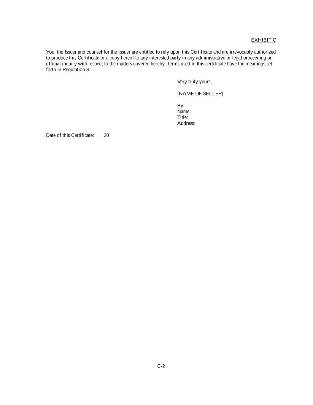 C-2 EXHIBIT C You, the Issuer and counsel for the Issuer are entitled to rely upon this Certificate and are irrevocably authorized to produce this Certificate or a copy hereof to any interested party in any administrative or legal proceeding or official inquiry with respect to the matters covered hereby. Terms used in this certificate have the meanings set forth in Regulation S. Very truly yours, [NAME OF SELLER] By: Name: Title: Address: Date of this Certificate: , 20