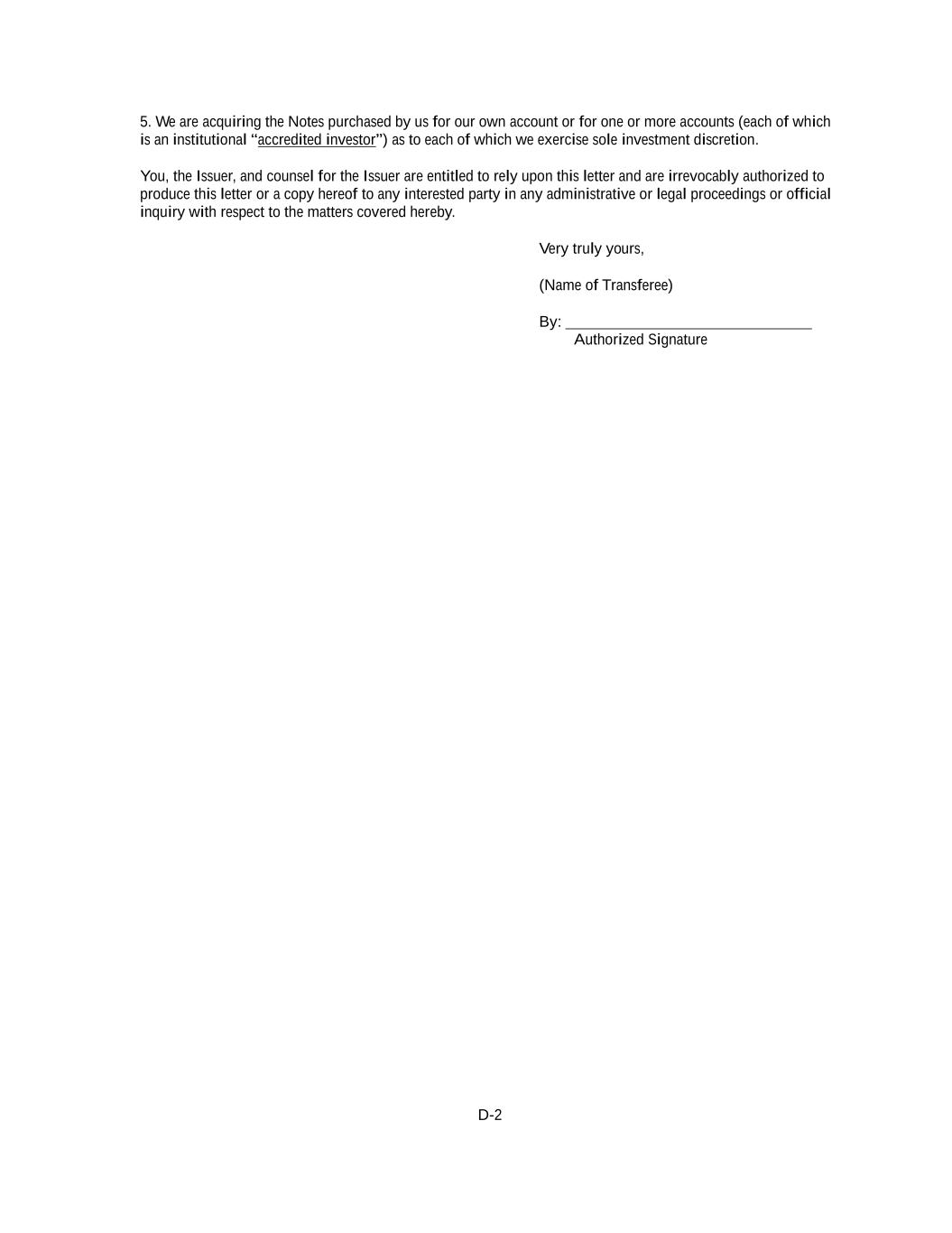 D-2 5. We are acquiring the Notes purchased by us for our own account or for one or more accounts (each of which is an institutional “accredited investor”) as to each of which we exercise sole investment discretion. You, the Issuer, and counsel for the Issuer are entitled to rely upon this letter and are irrevocably authorized to produce this letter or a copy hereof to any interested party in any administrative or legal proceedings or official inquiry with respect to the matters covered hereby. Very truly yours, (Name of Transferee) By: Authorized Signature