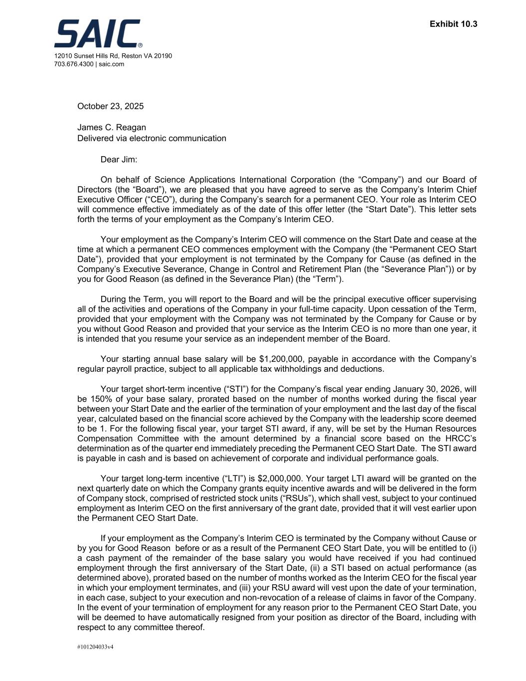 saic-20251031false2026Q300015711231/30xbrli:sharesiso4217:USDiso4217:USDxbrli:sharessaic:reportingUnitsaic:segmentxbrli:pure00015711232025-02-012025-10-3100015711232025-11-2100015711232025-08-022025-10-3100015711232024-08-032024-11-0100015711232024-02-032024-11-0100015711232025-10-3100015711232025-01-310001571123us-gaap:CommonStockMember2025-08-010001571123us-gaap:AdditionalPaidInCapitalMember2025-08-010001571123us-gaap:RetainedEarningsMember2025-08-010001571123us-gaap:AccumulatedOtherComprehensiveIncomeMember2025-08-0100015711232025-08-010001571123us-gaap:RetainedEarningsMember2025-08-022025-10-310001571123us-gaap:AdditionalPaidInCapitalMember2025-08-022025-10-310001571123us-gaap:AccumulatedOtherComprehensiveIncomeMember2025-08-022025-10-310001571123us-gaap:CommonStockMember2025-08-022025-10-310001571123us-gaap:CommonStockMember2025-10-310001571123us-gaap:AdditionalPaidInCapitalMember2025-10-310001571123us-gaap:RetainedEarningsMember2025-10-310001571123us-gaap:AccumulatedOtherComprehensiveIncomeMember2025-10-310001571123us-gaap:CommonStockMember2025-01-310001571123us-gaap:AdditionalPaidInCapitalMember2025-01-310001571123us-gaap:RetainedEarningsMember2025-01-310001571123us-gaap:AccumulatedOtherComprehensiveIncomeMember2025-01-310001571123us-gaap:RetainedEarningsMember2025-02-012025-10-310001571123us-gaap:AdditionalPaidInCapitalMember2025-02-012025-10-310001571123us-gaap:AccumulatedOtherComprehensiveIncomeMember2025-02-012025-10-310001571123us-gaap:CommonStockMember2025-02-012025-10-310001571123us-gaap:CommonStockMember2024-08-020001571123us-gaap:AdditionalPaidInCapitalMember2024-08-020001571123us-gaap:RetainedEarningsMember2024-08-020001571123us-gaap:AccumulatedOtherComprehensiveIncomeMember2024-08-0200015711232024-08-020001571123us-gaap:RetainedEarningsMember2024-08-032024-11-010001571123us-gaap:AdditionalPaidInCapitalMember2024-08-032024-11-010001571123us-gaap:AccumulatedOtherComprehensiveIncomeMember2024-08-032024-11-010001571123us-gaap:CommonStockMember2024-08-032024-11-010001571123us-gaap:RetainedEarningsMember2024-02-032024-11-010001571123us-gaap:CommonStockMember2024-11-010001571123us-gaap:AdditionalPaidInCapitalMember2024-11-010001571123us-gaap:RetainedEarningsMember2024-11-010001571123us-gaap:AccumulatedOtherComprehensiveIncomeMember2024-11-0100015711232024-11-010001571123us-gaap:CommonStockMember2024-02-020001571123us-gaap:AdditionalPaidInCapitalMember2024-02-020001571123us-gaap:RetainedEarningsMember2024-02-020001571123us-gaap:AccumulatedOtherComprehensiveIncomeMember2024-02-0200015711232024-02-020001571123us-gaap:AdditionalPaidInCapitalMember2024-02-032024-11-010001571123us-gaap:AccumulatedOtherComprehensiveIncomeMember2024-02-032024-11-010001571123us-gaap:CommonStockMember2024-02-032024-11-010001571123us-gaap:EmployeeStockMember2024-02-032024-11-010001571123us-gaap:EmployeeStockMember2025-02-012025-10-310001571123saic:ExistingStockRepurchasePlanMember2025-02-012025-10-310001571123srt:MaximumMembersaic:ExistingStockRepurchasePlanMember2025-10-310001571123saic:StockRepurchasePlanMember2025-10-312025-10-310001571123srt:MaximumMembersaic:StockRepurchasePlanMember2025-10-310001571123saic:DepartmentOfDefenseMembersaic:DefenseAndIntelligenceMember2025-08-022025-10-310001571123saic:DepartmentOfDefenseMembersaic:CivilianMember2025-08-022025-10-310001571123saic:DepartmentOfDefenseMember2025-08-022025-10-310001571123saic:DepartmentOfDefenseMembersaic:DefenseAndIntelligenceMember2024-08-032024-11-010001571123saic:DepartmentOfDefenseMembersaic:CivilianMember2024-08-032024-11-010001571123saic:DepartmentOfDefenseMember2024-08-032024-11-010001571123saic:OtherFederalGovernmentAgenciesMembersaic:DefenseAndIntelligenceMember2025-08-022025-10-310001571123saic:OtherFederalGovernmentAgenciesMembersaic:CivilianMember2025-08-022025-10-310001571123saic:OtherFederalGovernmentAgenciesMember2025-08-022025-10-310001571123saic:OtherFederalGovernmentAgenciesMembersaic:DefenseAndIntelligenceMember2024-08-032024-11-010001571123saic:OtherFederalGovernmentAgenciesMembersaic:CivilianMember2024-08-032024-11-010001571123saic:OtherFederalGovernmentAgenciesMember2024-08-032024-11-010001571123saic:CommercialStateAndLocalAgenciesMembersaic:DefenseAndIntelligenceMember2025-08-022025-10-310001571123saic:CommercialStateAndLocalAgenciesMembersaic:CivilianMember2025-08-022025-10-310001571123saic:CommercialStateAndLocalAgenciesMember2025-08-022025-10-310001571123saic:CommercialStateAndLocalAgenciesMembersaic:DefenseAndIntelligenceMember2024-08-032024-11-010001571123saic:CommercialStateAndLocalAgenciesMembersaic:CivilianMember2024-08-032024-11-010001571123saic:CommercialStateAndLocalAgenciesMember2024-08-032024-11-010001571123saic:DefenseAndIntelligenceMember2025-08-022025-10-310001571123saic:CivilianMember2025-08-022025-10-310001571123saic:DefenseAndIntelligenceMember2024-08-032024-11-010001571123saic:CivilianMember2024-08-032024-11-010001571123saic:DepartmentOfDefenseMembersaic:DefenseAndIntelligenceMember2025-02-012025-10-310001571123saic:DepartmentOfDefenseMembersaic:CivilianMember2025-02-012025-10-310001571123saic:DepartmentOfDefenseMember2025-02-012025-10-310001571123saic:DepartmentOfDefenseMembersaic:DefenseAndIntelligenceMember2024-02-032024-11-010001571123saic:DepartmentOfDefenseMembersaic:CivilianMember2024-02-032024-11-010001571123saic:DepartmentOfDefenseMember2024-02-032024-11-010001571123saic:OtherFederalGovernmentAgenciesMembersaic:DefenseAndIntelligenceMember2025-02-012025-10-310001571123saic:OtherFederalGovernmentAgenciesMembersaic:CivilianMember2025-02-012025-10-310001571123saic:OtherFederalGovernmentAgenciesMember2025-02-012025-10-310001571123saic:OtherFederalGovernmentAgenciesMembersaic:DefenseAndIntelligenceMember2024-02-032024-11-010001571123saic:OtherFederalGovernmentAgenciesMembersaic:CivilianMember2024-02-032024-11-010001571123saic:OtherFederalGovernmentAgenciesMember2024-02-032024-11-010001571123saic:CommercialStateAndLocalAgenciesMembersaic:DefenseAndIntelligenceMember2025-02-012025-10-31000157112